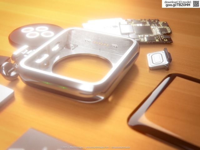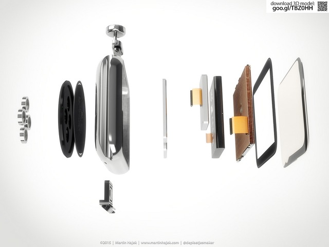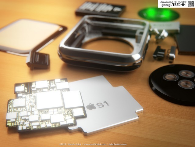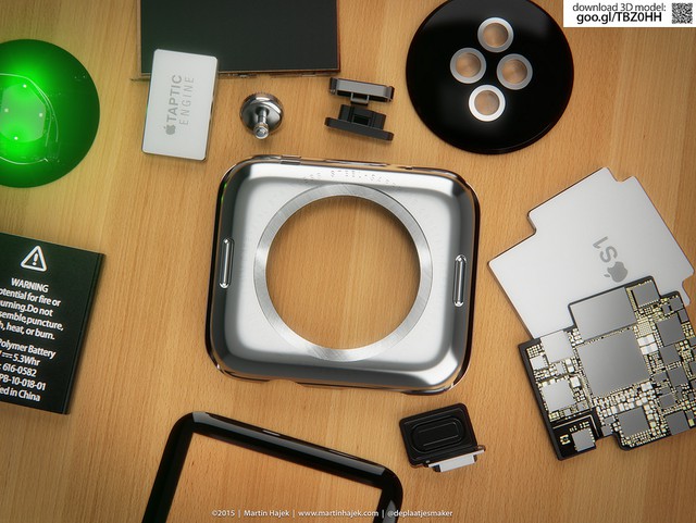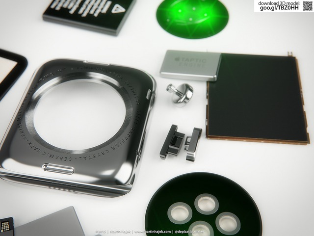 Mặc dù đây chỉ là những bức ảnh dựng do Hajek thiết kế, nhưng chúng ta cũng có thể thấy tất cả những linh kiện bên trong từ vi xử lý S1 tới vi xử lý phụ Taptic Engin, núm xoay Digital Crown, cảm biến nhịp tim, khung kim loại, màn hình OLED, pin...