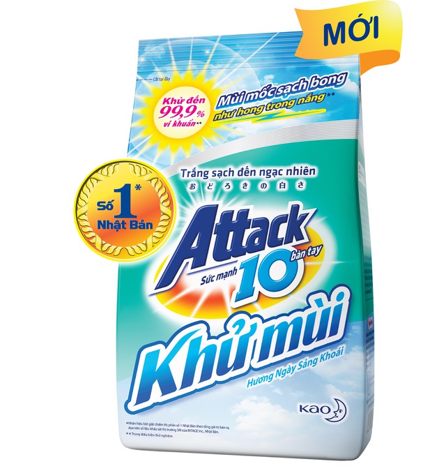 Phụ nữ có thể chọn sử dụng dòng sản phẩm bột giặt số 1 Nhật Bản (***) – bột giặt Attack Khử mùi mới, sử dụng công nghệ khử mùi Nhật Bản với hoạt chất khử mùi chuyên biệt có thể khử đến 99,9% (**) vi khuẩn gây mùi ẩm mốc trên áo quần giúp khử mùi hiệu quả như phơi dưới nắng. Khi khử được mùi hôi, mùi ẩm mốc hiệu quả trên áo quần với bột giặt Attack Khử mùi, áo quần dù giặt và phơi ban đêm, phơi trong nhà hay vào mùa mưa, nồm, thiếu ánh nắng tự nhiên sẽ chẳng còn là nỗi bận tâm của phụ nữ nữa. Bột giặt Attack được thiết kế thích hợp cho cả giặt tay và giặt máy.