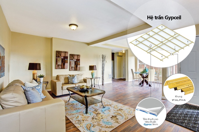 Với hệ trần Gypceil bao gồm hệ khung Vĩnh Tường ALPHA và tấm thạch cao Gyproc bạn có thể thiết kế nhiều kiểu trần ấn tượng để biến không gian phòng khách thành điểm nhấn chính cho ngôi nhà.