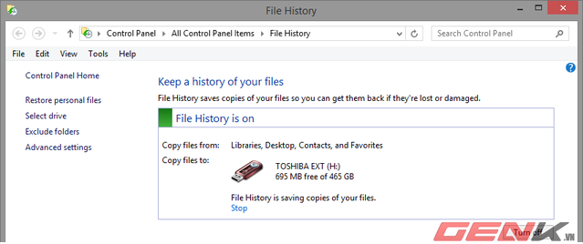 Do đó, để đảm bảo không vấp phải những sai lầm khi sử dụng và làm việc trên Windows, bạn nên thực hiện việc thường xuyên sao lưu dữ liệu. Thật may là Windows có trang bị sẳn tính năng File History giúp thực hiện quá trình sao lưu một cách tự động, tương tự tính năng Time Machine của Apple.