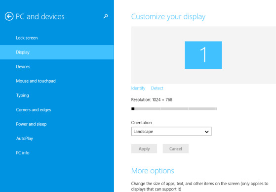 Một cải tiến đáng chú ý nữa trên Windows 8.1 đó là giao diện Settings cho Modern UI. Với trang Settings mới này, người dùng giao diện Modern UI sẽ dễ dàng hơn rất nhiều trong việc thiết lập các cài đặt trên thiết bị của mình, và họ không còn phải truy cập vào Control Panel như trên Windows 8 nữa - một thao tác rất bất tiện cho những ai dùng Windows 8 trên màn hình cảm ứng. Bạn có thể thiết lập cho màn hình (độ phân giải...), chuột, touchpad...thông qua các thao tác chạm thân thiện với thiết bị dùng màn hình cảm ứng.