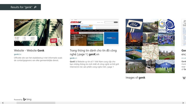 Một sự bổ sung tuyệt vời khác của Windows 8.1 đó là HĐH này được trang bị công cụ tìm kiếm tổng hợp vô cùng tiện lợi. Từ thanh Charm của HĐH, bạn có thể thực hiện việc tìm kiếm dữ liệu không chỉ trên máy tính, mà còn trên toàn bộ internet. Ví dụ với từ khóa GenK, bạn có thể tìm kiếm các dữ liệu được lưu trong máy liên quan tới từ khóa này; các từ khóa tương tự; các kết quả tìm kiếm GenK trên Bing, Wikipedia...như bài viết, ảnh...