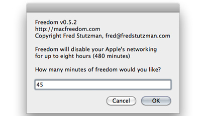 Freedom giúp bạn vô hiệu hóa kết nối internet của máy Mac trong một khoảng thời gian mà bạn định trước. Điều này nghe chừng...không hợp lý bởi kết nối internet đang trở thành một nhu cầu thường ngày, tuy nhiên, trong trường hợp bạn cần tập trung vào một công việc, dự án nào đó, việc tạm thời vô hiệu hóa internet sẽ giúp bạn tập trung hơn vào công việc chính.