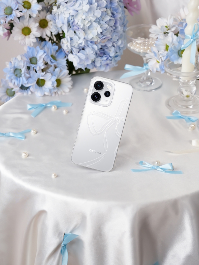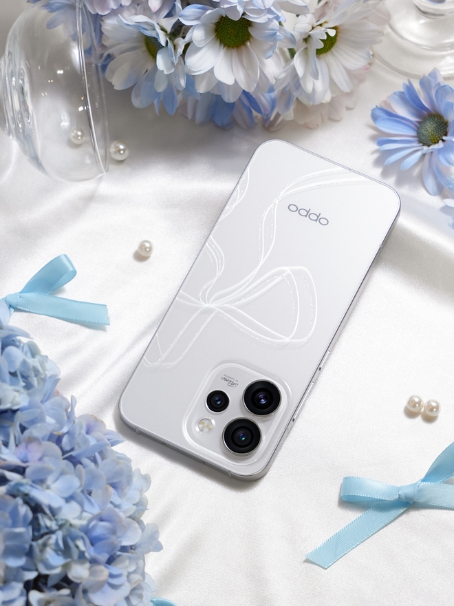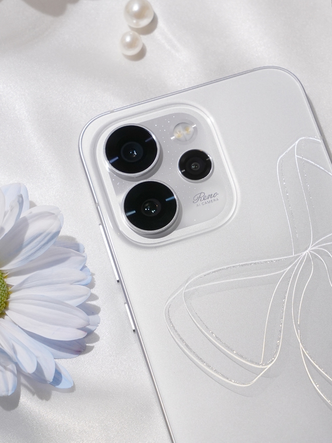 Phiên bản màu trắng của OPPO Reno15 thậm chí còn được OPPO khắc họa lên hình chiếc nơ, nhìn rõ dưới ánh sáng - Ảnh: Weibo