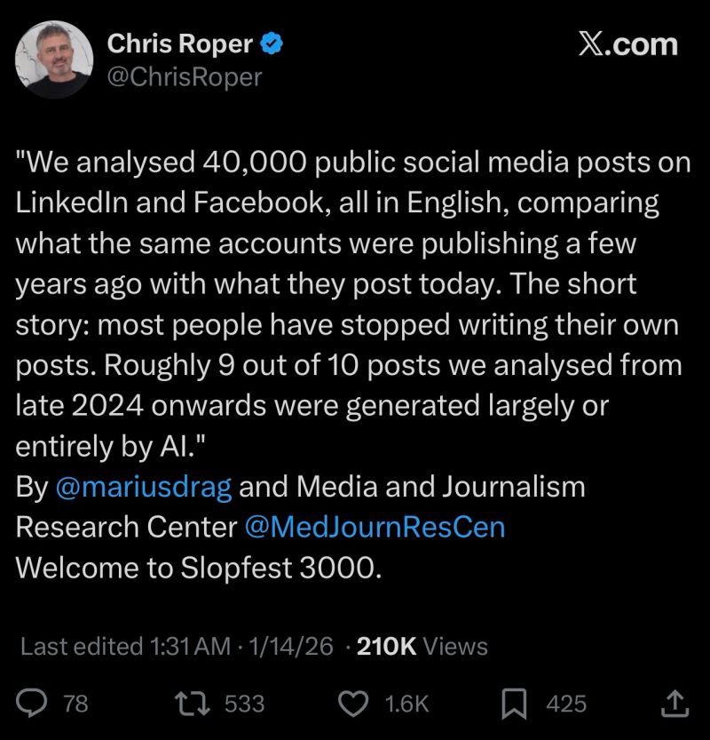 Một nghiên cứu mới của Trung tâm Nghiên cứu Truyền thông và Báo chí (MJRC) vừa công bố phát hiện gây chấn động về thực trạng truyền thông trên mạng xã hội. Sau khi phân tích 40.000 bài đăng tiếng Anh từ 2.000 tài khoản công khai trên LinkedIn và Facebook trong giai đoạn cuối năm 2024 đến đầu năm 2025, các nhà nghiên cứu phát hiện rằng khoảng 90% bài đăng được phân loại là chủ yếu hoặc hoàn toàn do AI tạo ra. Nói cách khác, cứ 10 bài đăng bạn đọc trên mạng xã hội, có đến 9 bài không phải do con người viết.
