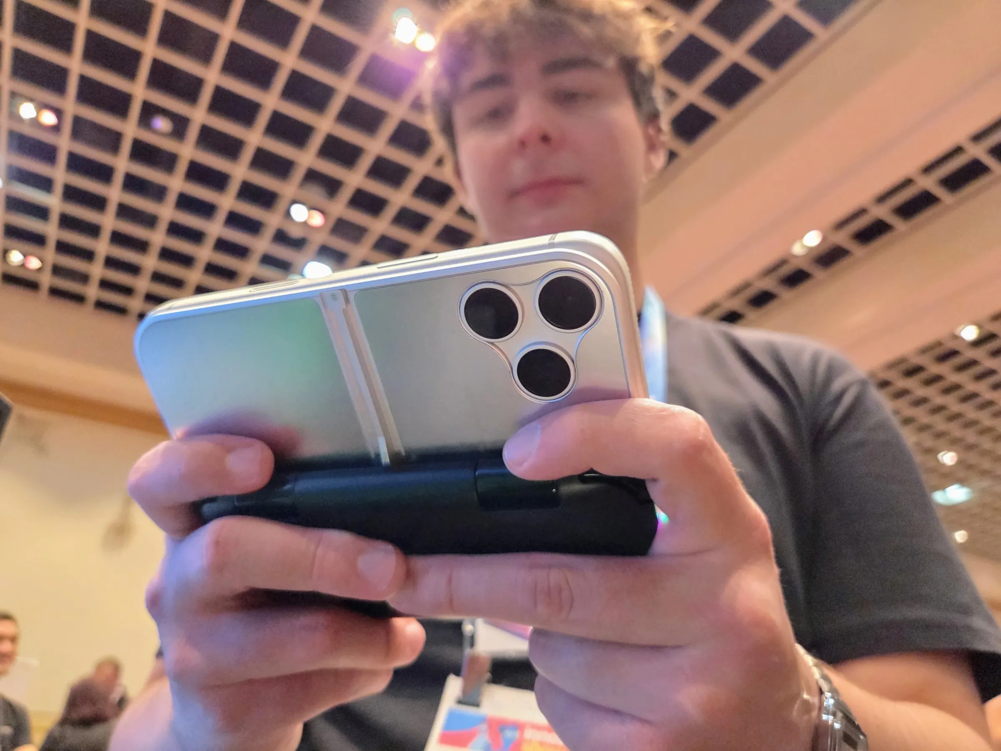 Sản phẩm được nhắc tới là MCON của OhSnap. Đây là tay cầm chơi game Bluetooth, gắn trực tiếp vào mặt lưng iPhone hoặc smartphone Android bằng nam châm. Với các máy Android chưa hỗ trợ Qi2, hãng tặng kèm vòng nam châm để dán vào máy.