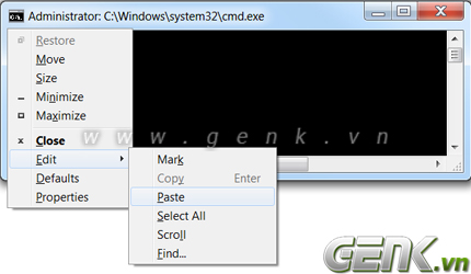 Tất nhiên những thao tác nào có thể làm bằng chuột thì hầu như đều có thể làm bằng bàn phím, để thực hiện lệnh Paste vào cửa sổ Command Prompt bạn có thể nhấn tổi hợp phí Alt Space (nút cách) để mở menu của cửa sổ Command Prompt sau đó nhấn nút E để mở mục Edit và nhấn nút P để thực hiện lệnh Paste, tuy nhiên nó thật quá dài dòng.