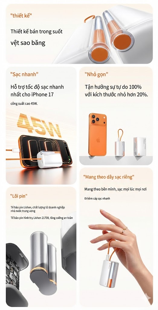 Sản phẩm có 2 tùy chọn màu sắc, trong đó một phiên bản được phối màu tương thích với iPhone 17 Pro bản Cosmic Orange, hướng tới nhóm người dùng chú trọng cả tính tiện dụng lẫn yếu tố thẩm mỹ. Hiện tại, nếu tìm mua pin dự phòng nhỏ gọn, dung lượng lớn, bạn có thể tham khảo các mẫu như Cuktech 10 Mini 10.000mAh (~660.000đ), Baseus Mini 5.000mAh (~400.000đ), Ugreen Mini 5.000mAh (~400.000đ).