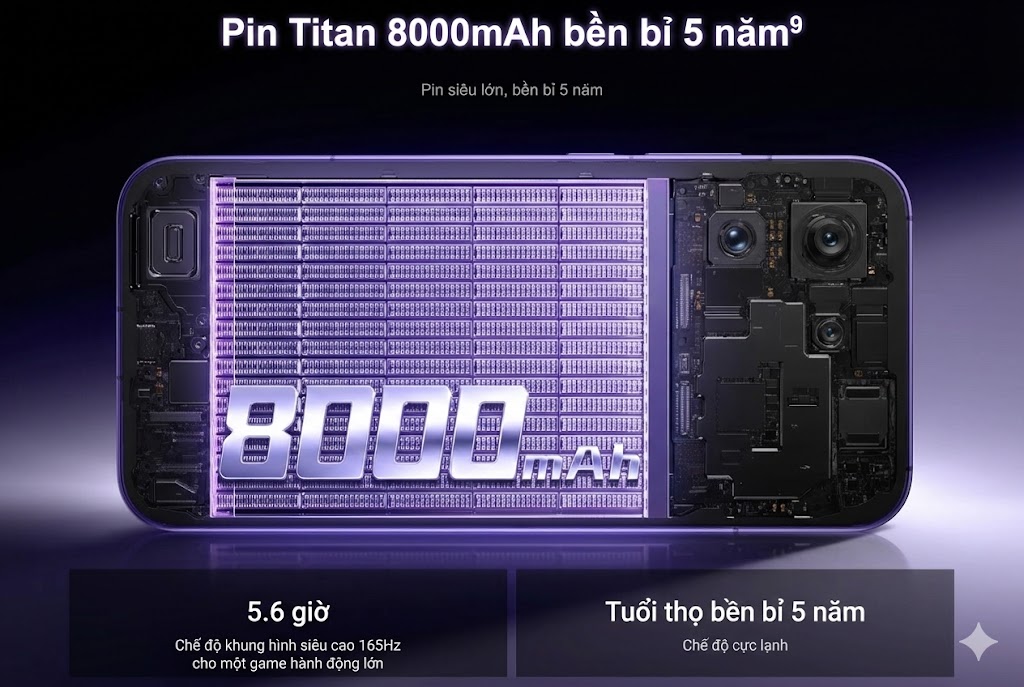 Pin là điểm nhấn lớn nhất của Neo8 với dung lượng 8.000mAh. Realme cho biết pin dùng anode chứa 16% silicon, tăng mật độ năng lượng thêm khoảng 3% so với thế hệ trước, giúp giữ độ mỏng thân máy ở mức 8.3mm. Máy hỗ trợ sạc nhanh SuperVOOC 80W và sạc bypass, cho phép lấy điện trực tiếp từ củ sạc khi chơi game để giảm nhiệt cho pin.