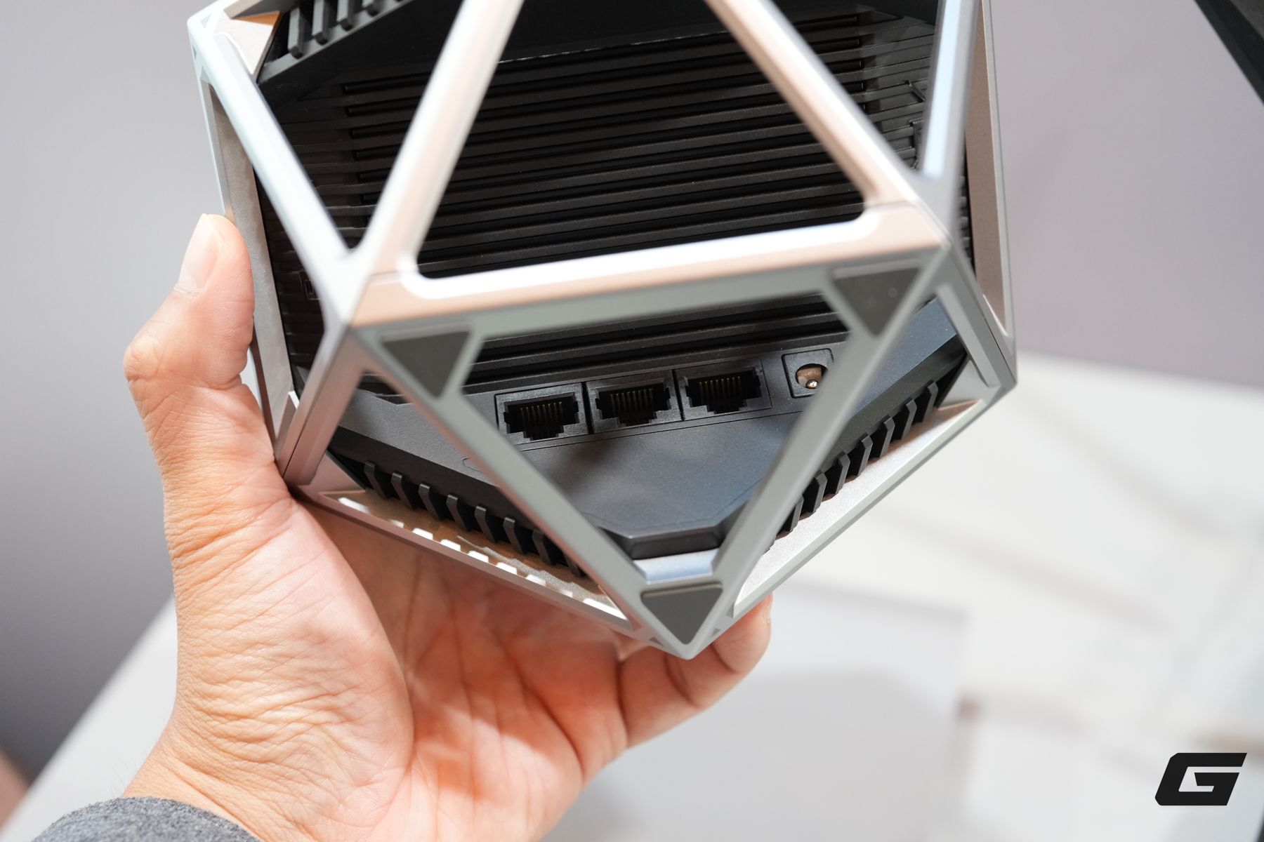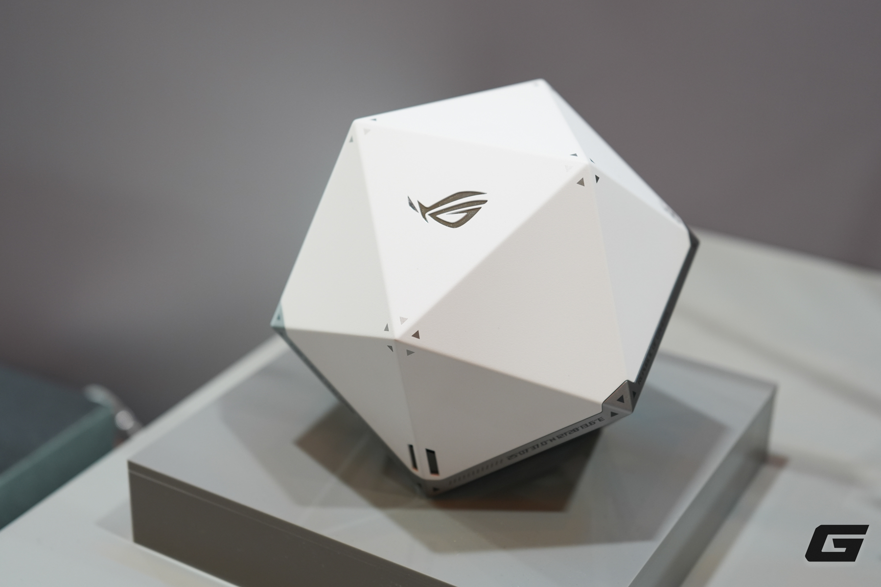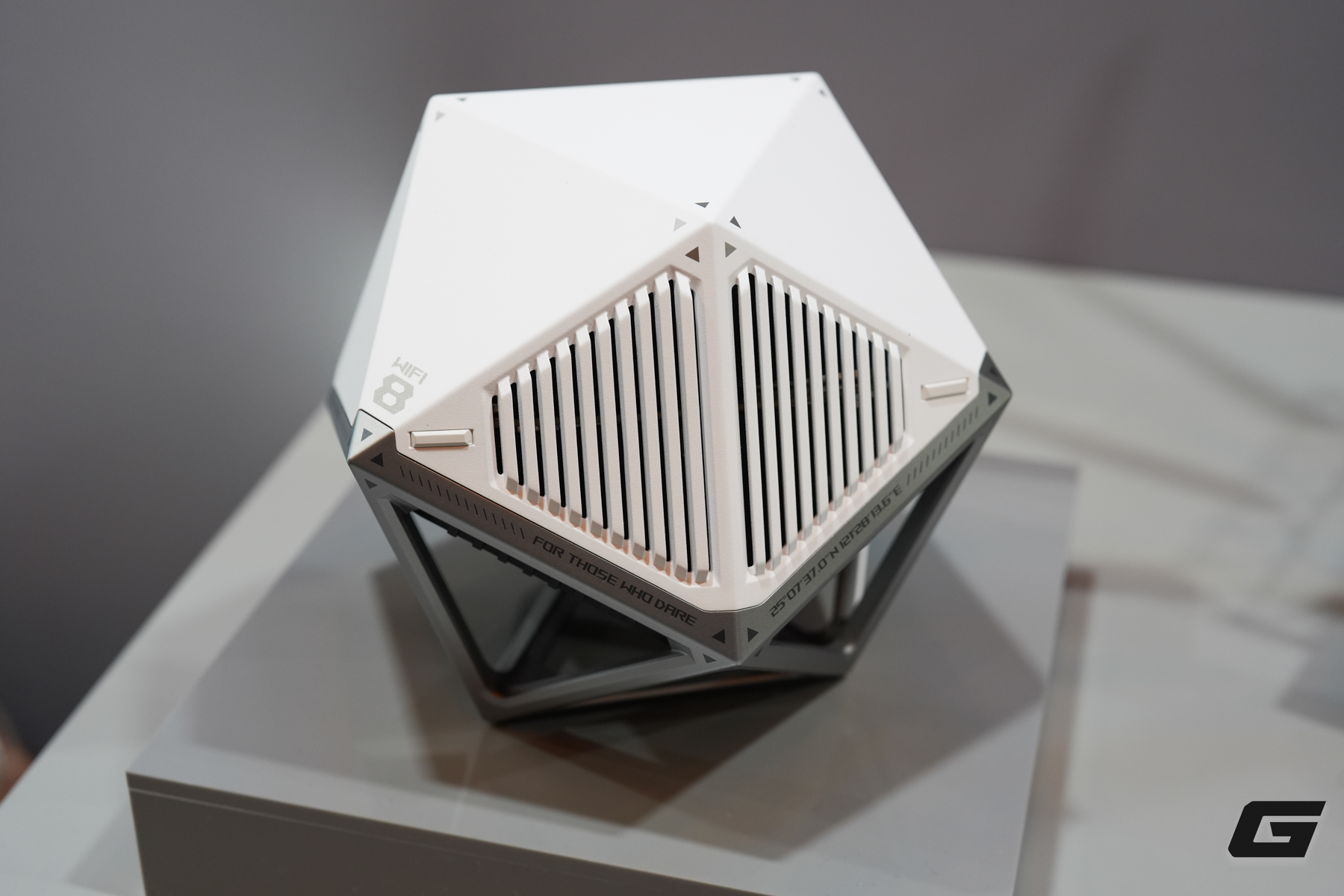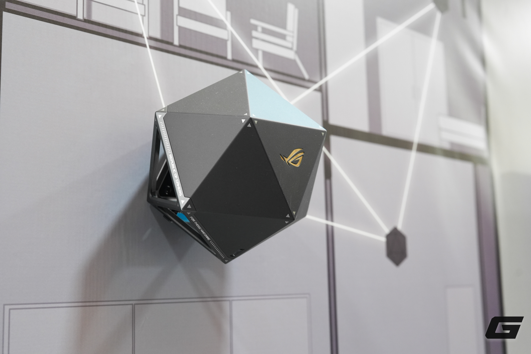 Nhưng gây chú ý nhất tại khu vực trưng bày chính là ASUS ROG. Thay vì những chiếc router trông như con "nhện máy", ASUS giới thiệu bản concept ROG NeoCore. Đây là một khối đa diện nhìn cực kỳ giống một viên xúc xắc 20 mặt với phần đáy rỗng và... hoàn toàn không có anten ngoài. ASUS khẳng định NeoCore sẽ cung cấp thông lượng cao hơn và độ trễ thấp hơn đáng kể so với các dòng hiện tại.