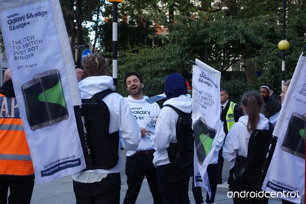 Tại Apple Store trên Phố Regent, một nhóm nhân viên Samsung đã xuất hiện để quảng bá chiếc điện thoại Samsung Galaxy S6 Edge Plus.