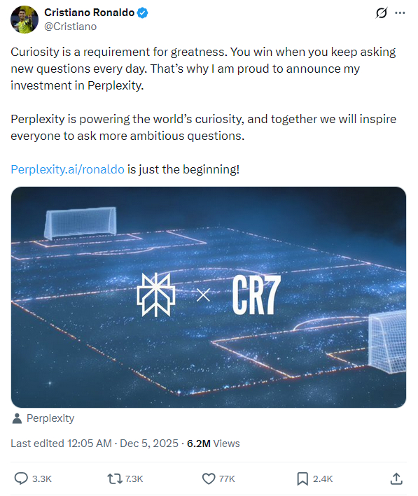 Bài đăng của Ronaldo thông báo đầu tư vào Perplexity