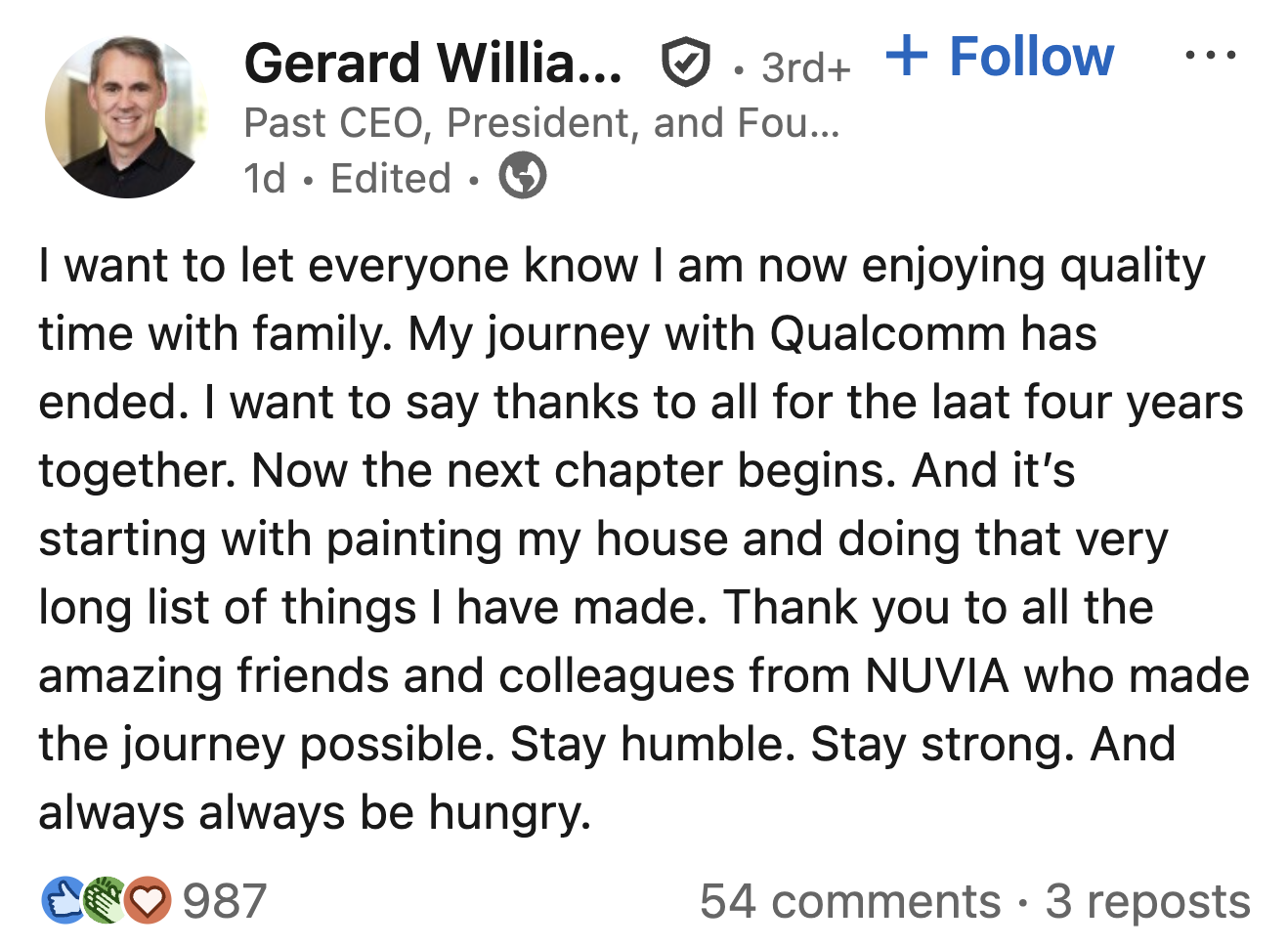 Sau đúng 4 năm kể từ khi Qualcomm thâu tóm NUVIA, Gerard Williams III đã chính thức nói lời chia tay với hãng bán dẫn Mỹ. Thông tin được chính ông xác nhận qua LinkedIn cá nhân, khép lại một giai đoạn được xem là mang tính bước ngoặt trong tham vọng "tự làm CPU" của Qualcomm.