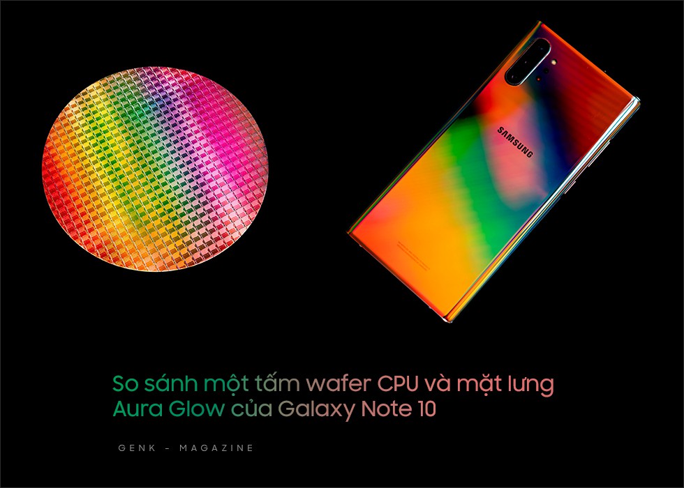 Theo như Samsung công bố, thì quá trình này không hề đơn giản, ta không thể sử dụng dao kéo thông thường để tạo ra các đường khắc được. Thay vào đó, hãng đã học tập quá trình 'quang khắc nano' đã được các nhà sản xuất CPU sử dụng trong việc tạo bóng bán dẫn siêu nhỏ. Và khi so sánh mặt lưng của Galaxy Note10 Aura Glow và một tấm wafer CPU đặt dưới ánh sáng mạnh, thì ta tìm thấy sự tương đồng đến ngạc nhiên.
