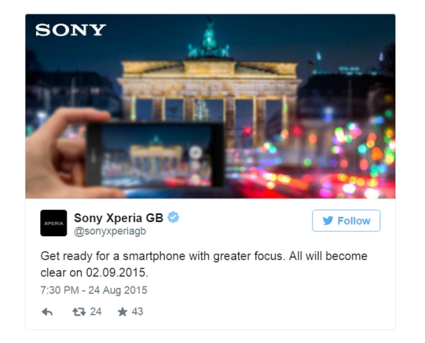 Sony mới đây đã thông báo trên trang Twitter chính thức của mình rằng họ sẽ ra mắt 1 smartphone mới vào ngày 2/9 tới với khả năng lấy nét tốt hơn. Giới thạo tin nhận định hãng sản xuất Nhật Bản muốn ám chỉ tới chiếc flagship Xperia Z5 mà nhiều người chờ đợi.