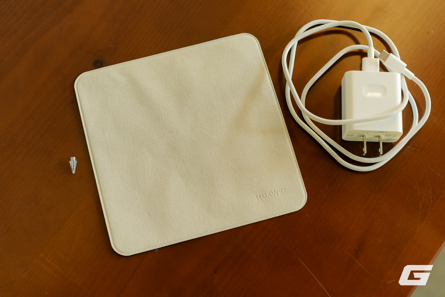 Ngoài bút và bao da bàn phím, Huawei cũng tặng luôn 1 khăn lau màn hình na ná Apple Cloth, củ cáp sạc nhanh 40W và 1 đầu bút thay thế.
