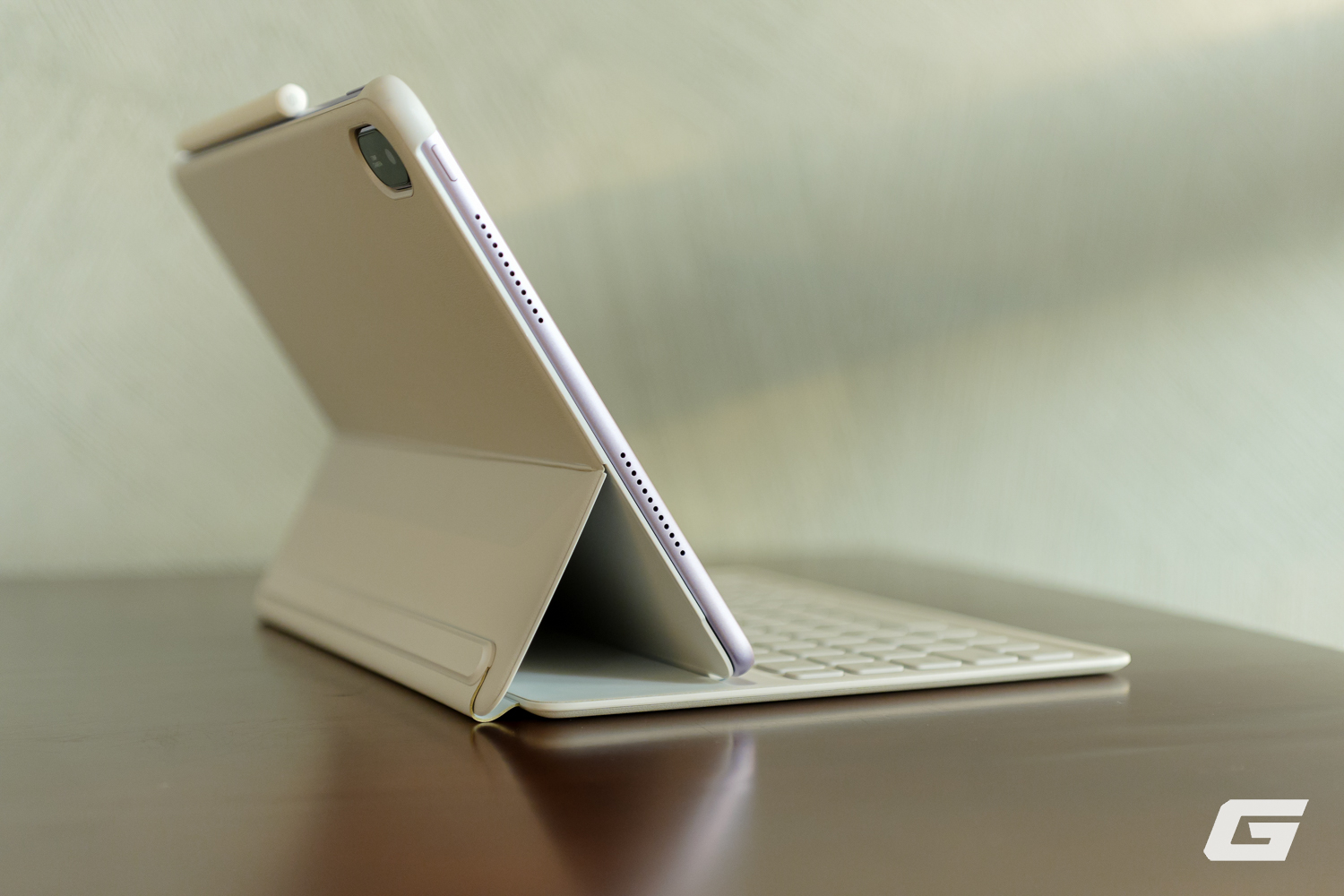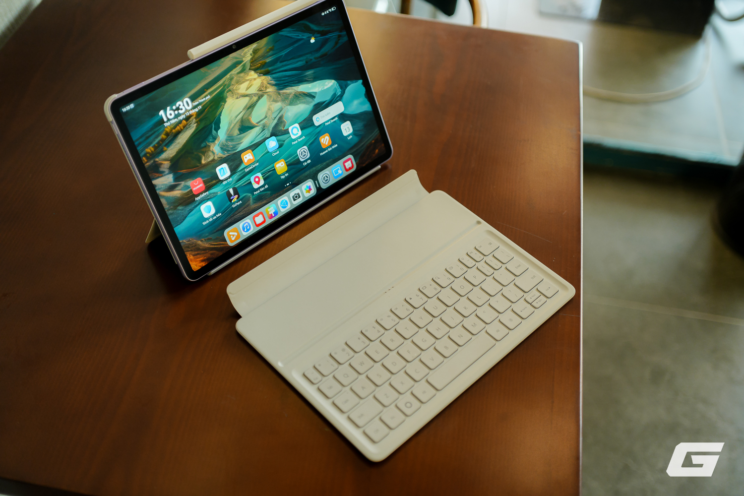 Quà tặng theo máy trong đợt mở bán là bộ phụ kiện gồm bàn phím clip-on, bút M Pencil Gen 3 và chuột không dây. Bàn phím được thiết kế mỏng, bám chắc vào thân máy, hành trình phím 1.5 mm và kích thước phím tiêu chuẩn 15 mm cho cảm giác gõ quen thuộc như laptop. Chuột không dây tăng tính linh hoạt khi làm việc, đặc biệt trong các tác vụ văn phòng hoặc chỉnh sửa tài liệu. Bút cảm ứng có khả năng gắn từ tính ở cạnh máy để sạc và cất giữ gọn gàng.