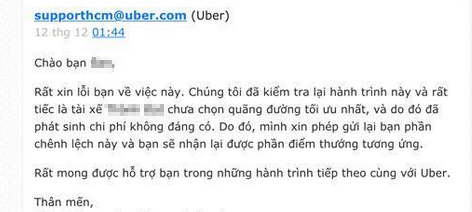 Đã có nhiều trường hợp được ghi nhận cho thấy phía Uber đã đưa ra lời xin lỗi và hoàn tiền, nếu như quãng đường người dùng đi cùng Uber dài hơn so với quãng đường hợp lý. Dưới đây là 1 ví dụ: