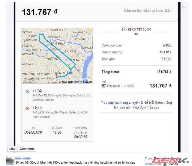 Một hành khách Việt phản ánh tài xế Uber đi theo đường vòng khiến cho chi phí bị đội lên gấp 4 lần.