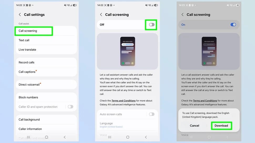 Tại đây, bạn nhấn vào mục Call Screening , sau đó gạt thanh trạng thái sang chế độ BẬT (ON) ở ngay đầu trang. Hệ thống sẽ yêu cầu bạn chọn ngôn ngữ. Nếu bạn chọn bất kỳ ngôn ngữ nào khác ngoài tiếng Anh (Mỹ), bạn sẽ cần nhấn Tải xuống (Download) gói ngôn ngữ đó.
