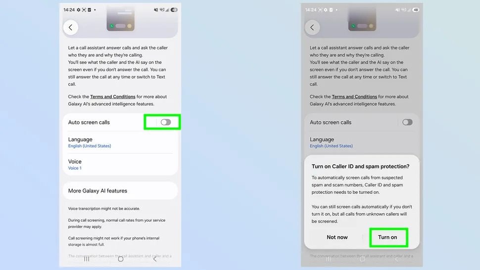 Galaxy AI có khả năng tự động sàng lọc các cuộc gọi từ số lạ, nhưng trước hết bạn cần kích hoạt tính năng Auto Screen . Sau đó, hệ thống sẽ yêu cầu bạn xác nhận việc bật tính năng ID người gọi và bảo vệ chống spam (Caller ID and spam protection) . Chúng tôi khuyên bạn nên chọn Bật (Turn On) để đạt hiệu quả bảo mật cao nhất.