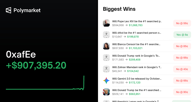 Một trong những cược đáng chú ý nhất là khoản 937.630 USD đặt vào việc Bianca Censori, vợ của rapper Kanye West, sẽ không đứng đầu bảng xếp hạng tìm kiếm. Khi kết quả được công bố đúng như dự đoán, khoản cược này mang về cho người dùng này 1,1 triệu USD. Tổng cộng, AlphaRacoon đã nắm giữ các vị thế mở trị giá 3,9 triệu USD trên nhiều kết quả tìm kiếm khác nhau, và hầu hết đều mang về lợi nhuận.