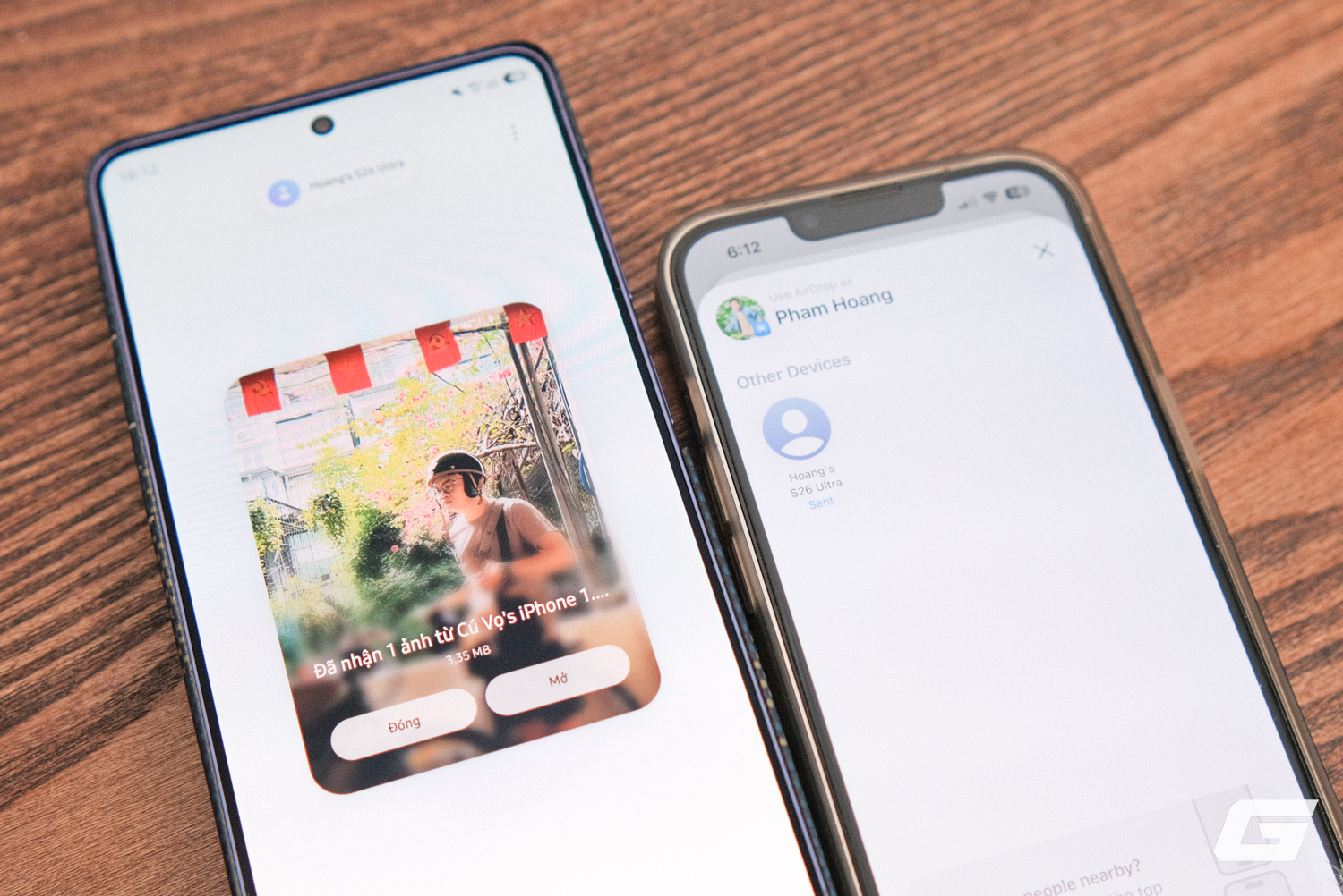 Sau khi bật tính năng, trải nghiệm thực tế gần như giống hệt dùng Quick Share hay AirDrop thông thường. Từ Galaxy S26 Ultra, chọn ảnh hoặc file, nhấn chia sẻ, chọn Quick Share - iPhone và MacBook gần đó hiện ra ngay trong danh sách thiết bị nhận. Phía iPhone cũng làm tương tự với AirDrop, Galaxy S26 xuất hiện như một thiết bị bình thường, chấp nhận là xong.