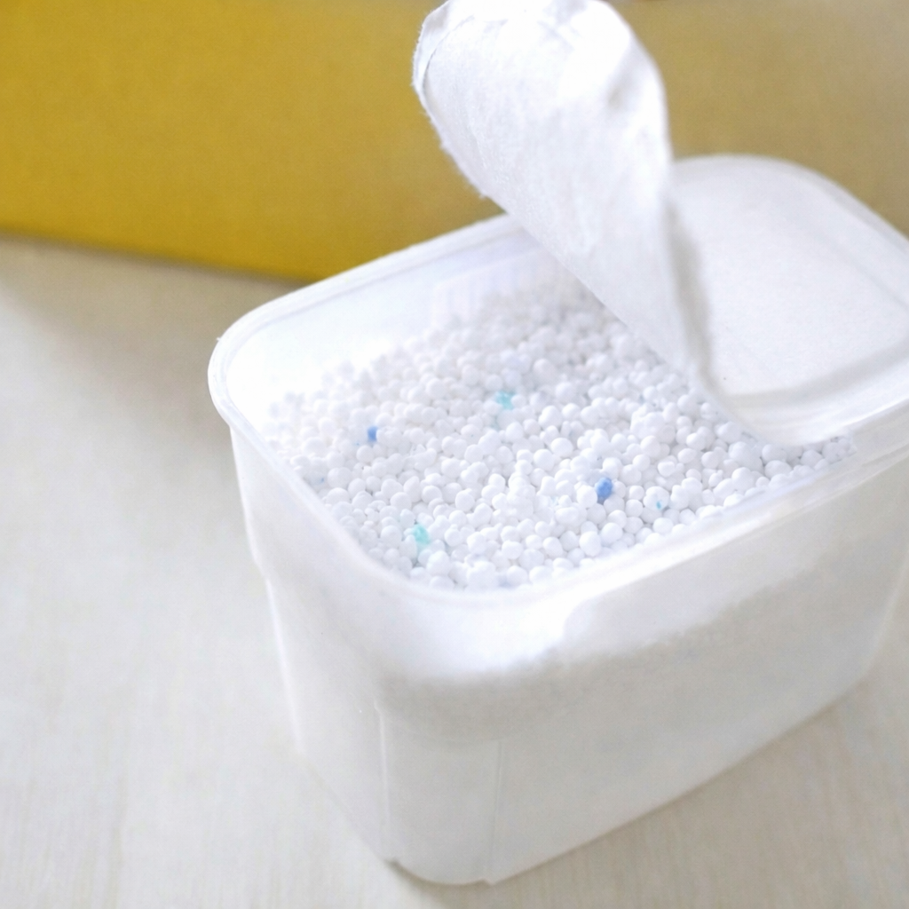 Calcium chloride có dạng hạt trắng, hơi to hơn muối ăn thông thường. Điểm đặc biệt nằm ở tính chất vật lý: chất này có khả năng hấp thụ hơi nước trong không khí và khi hút đủ ẩm sẽ tự hòa tan vào chính lượng nước đó. Kết quả là phần hạt rắn dần dần biến mất, chuyển thành dung dịch nước muối đậm đặc chảy xuống khay bên dưới.