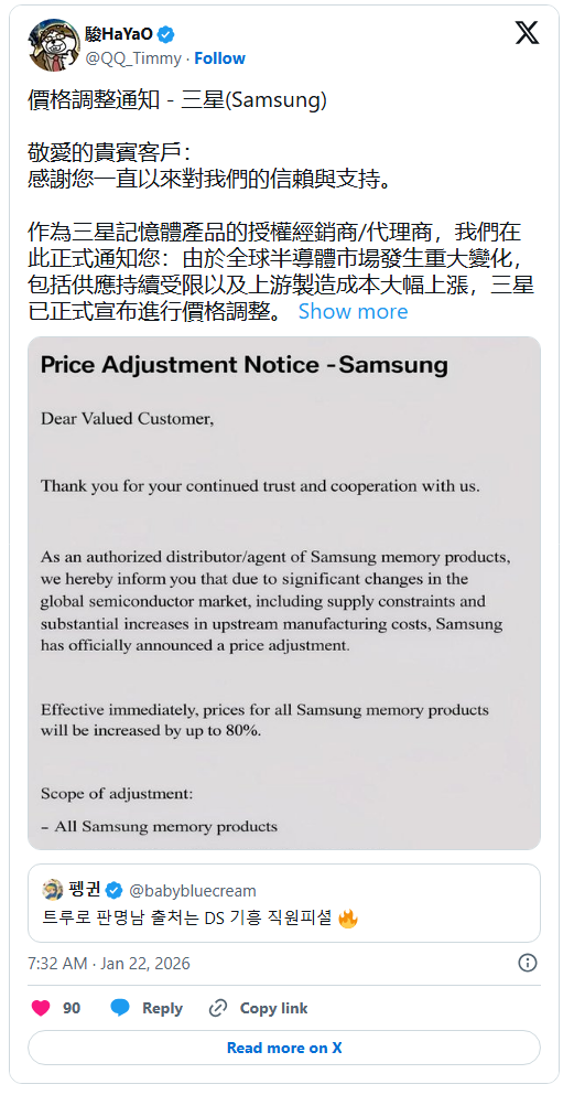 Bài đăng trên X cho biết về việc đại lý điều chỉnh tăng giá sản phẩm bộ nhớ của Samsung