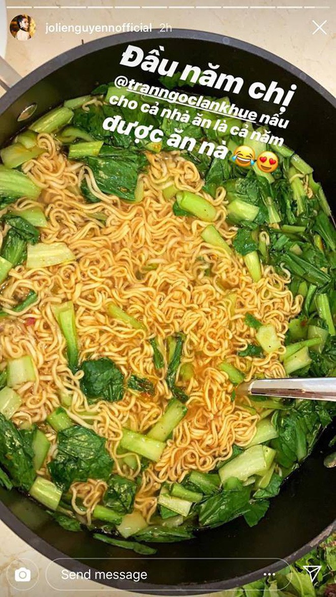 Sau đó thì cô nàng vui vẻ đón năm mới bên nhóm bạn thân và thưởng thức món... mì tôm rau cải