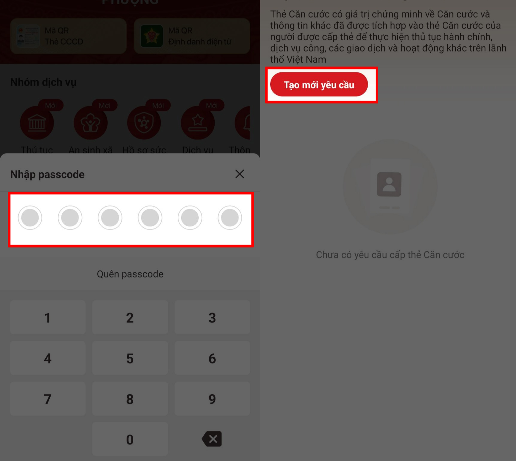 Bước 3: Hệ thống sẽ yêu cầu nhập passcode (mã bảo mật) để xác thực danh tính, hãy nhập đúng và nhấn vào vào mục Tạo mới yêu cầu để làm các bước tiếp theo.