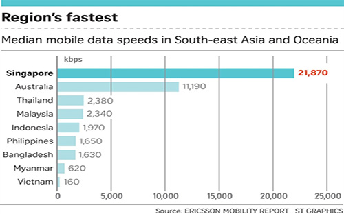 Theo đó, tốc độ truyền dữ liệu trung bình của Singapore đứng đầu bảng, đạt 21.870 kbps, nhanh gấp đôi quốc gia đứng thứ hai là Australia với tốc độ là 11.190 kbps và gấp hơn 9 lần nước đứng thứ ba là Thái Lan (2.380 kbps).