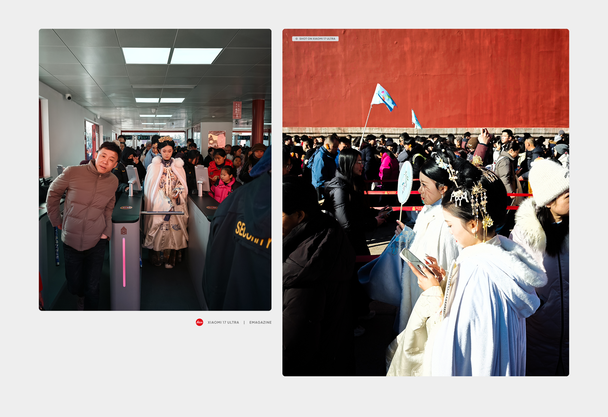 Giữa dòng người xếp hàng dài trước cổng soát vé của Tử Cấm Thành, hai cô gái trong trang phục phi tần bất ngờ xuất hiện, nổi bật giữa khung cảnh đông đúc và hiện đại xung quanh. Ánh nắng mùa đông không chỉ làm bừng sáng toàn bộ không gian mà còn vô tình tạo nên một chi tiết thị giác đầy tinh tế: chiếc quạt trên tay một trong hai cô gái hắt bóng hình lá cây lên gương mặt cô, như một lớp bóng phủ mềm mại được sắp đặt bởi chính ánh sáng và thiên nhiên, một sự tình cờ đẹp đến mức tưởng như đã được tính toán từ trước.