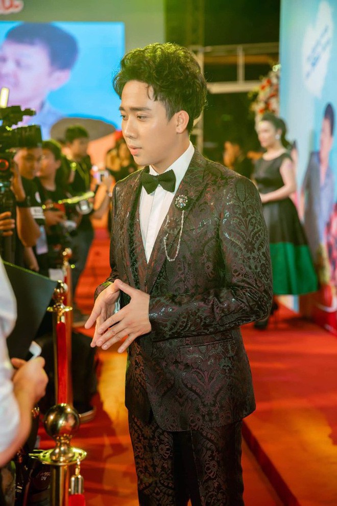 Diện nguyên bộ suit tối màu nhưng Trấn Thành không hề "dừ" khi khéo léo lựa chọn mẫu trang phục họa tiết chìm sang trọng, và mix cùng các phụ kiện như nơ cài cổ, cài áo, đồng hồ màu nổi.