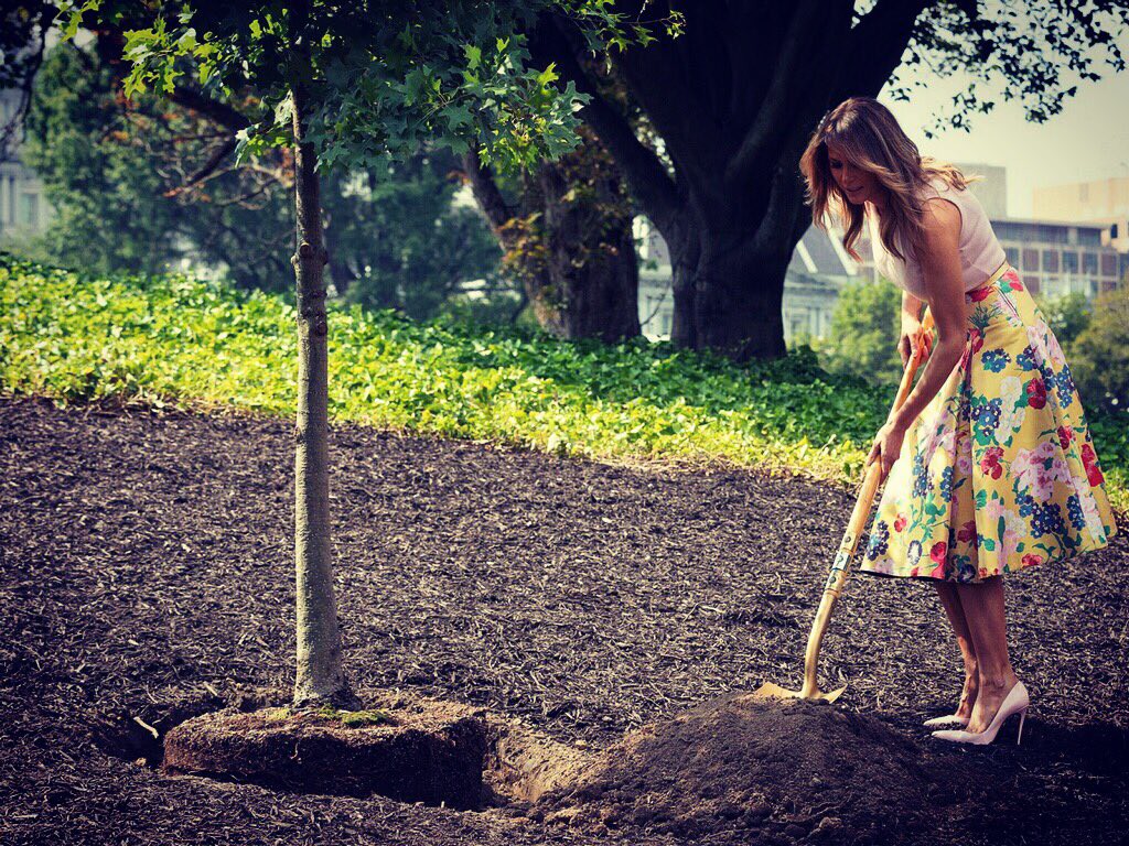 Lẽ bình thường, set đồ này của Đệ nhất Phu nhân Melania Trump chắc phải nhận được cơn mưa khen từ công chúng bởi nét nữ tính và quyến rũ khó cưỡng nhưng vẫn không kém phần thanh lịch, sang trọng. Tuy nhiên, cái sai ở đây chính là bà Melania đã diện chân váy hoa bồng xòe, điệu đà cùng giày cao gót 10 phân chỉ để… làm vườn.