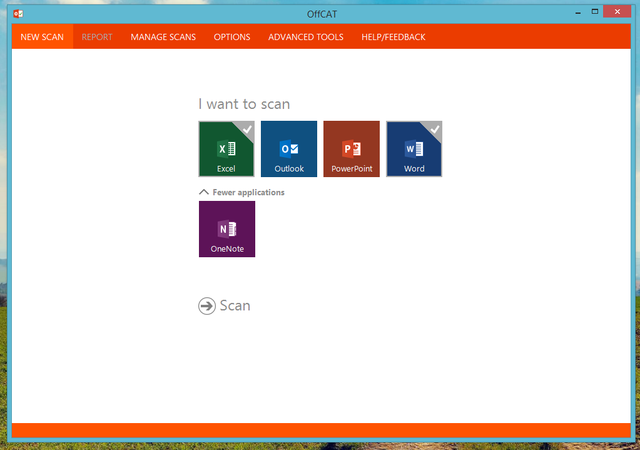 Màn hình chính của OffCAT sẽ là danh sách các ứng dụng nằm trong bộ Office mà người dùng cài đặt trên Windows. Bạn hãy tiến hành chọn 1 hoặc những ứng dụng mà bạn nhận thấy đang phát sinh “vấn đề” và nhấn Scan để OffCAT tiến hành kiểm tra.