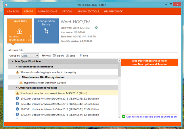 Sau khi kết thúc quá trình, OffCAT sẽ hiển thị báo cáo các thông tin và vấn đề cùng giải pháp mà bạn có thể áp dụng để giải quyết nó. Nhìn chung thì đa số sẽ yêu cầu bạn tiến hành tải các bản cập nhật vừa được Microsoft phát hành hoặc sử dụng công cụ Fix-It để vấn đề được giải quyết một cách triệt để.