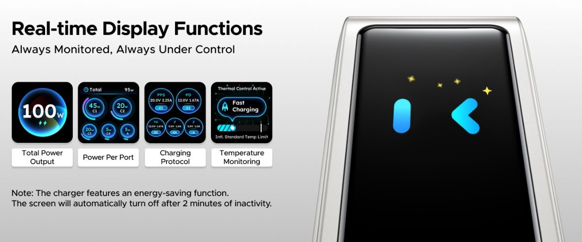 Điểm nhấn khác biệt của Nexode Pro 100W so với các mẫu sạc GaN thông thường nằm ở màn hình tích hợp ngay trên thân máy. Thông qua màn hình này, người dùng có thể theo dõi trực tiếp các thông tin liên quan đến quá trình sạc như mức phân phối công suất cho từng cổng, chuẩn giao thức sạc đang được sử dụng và cả nhiệt độ hoạt động của sạc.