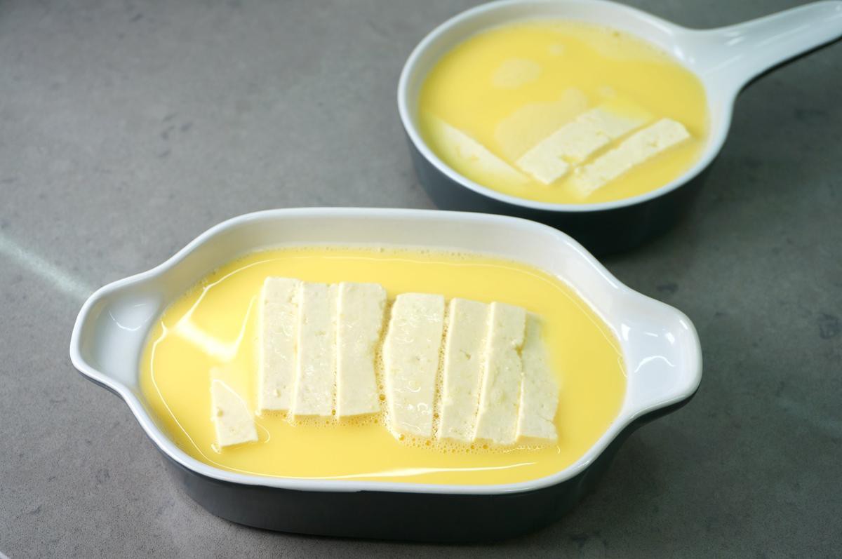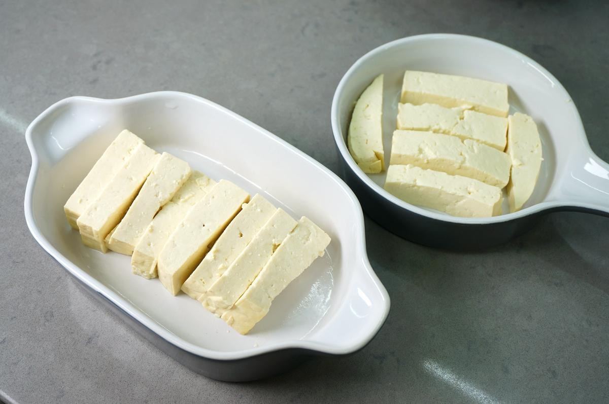 Đậu phụ cắt miếng xếp xuống đáy khuôn hoặc hũ chịu nhiệt.
