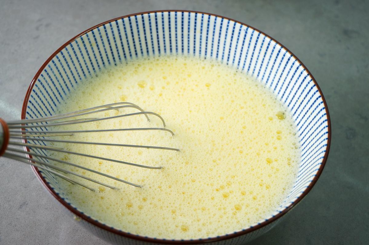 Trứng đánh tan cùng chút muối sau đó đổ nước nóng bằng 1,5 lần lượng trứng vào trộn đều.