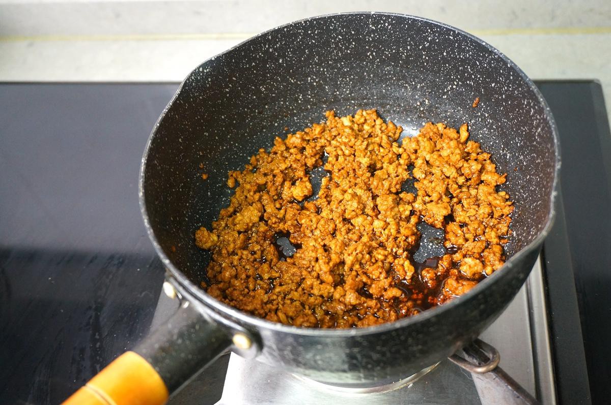 Cho chút dầu ăn vào chảo sau đó cho thịt vào rang cùng với chút nước tương và muối.