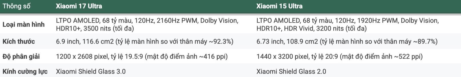 Không dừng lại ở đó, những thông số kỹ thuật đi kèm còn cho thấy sự nâng cấp về mặt thiết kế và khả năng bảo vệ mắt. Tần số Điều chế độ rộng xung (PWM) được nâng từ 1920Hz lên 2160Hz, giúp giảm thiểu hiện tượng mỏi mắt khi sử dụng điện thoại trong điều kiện thiếu sáng. Xiaomi 17 Ultra cũng đạt tỷ lệ màn hình so với thân máy lên tới 92.3%, vượt xa mức 89.7% của người tiền nhiệm.