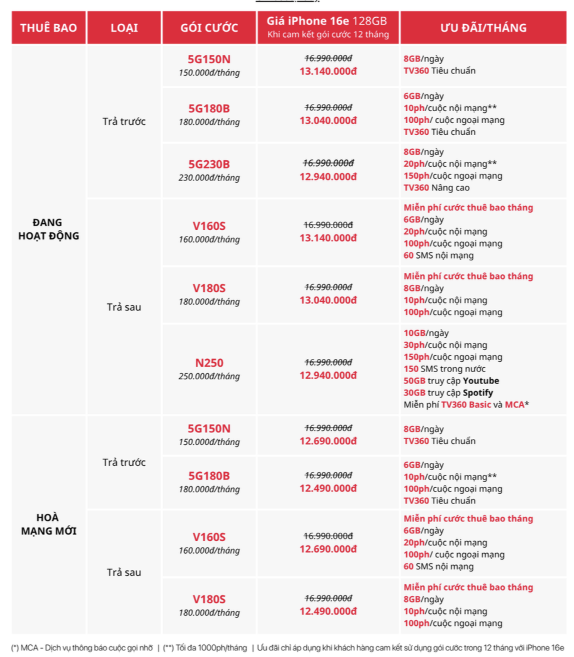 Các gói cước đi kèm chủ yếu xoay quanh nhóm 5G150X, 5G180X, 5G230X cho thuê bao trả trước (giá từ 150.000-230.000 đồng/tháng) và các gói trả sau như V160S, V180S, N250 (160.000-250.000 đồng/tháng). Quyền lợi nhìn chung gồm data 5G dung lượng lớn theo ngày, phút gọi nội mạng miễn phí theo giới hạn thời gian, ưu đãi phút ngoại mạng và các dịch vụ kèm theo như TV360. Ngoài ra, Viettel cũng có một vài ưu đãi dành cho các thuê bao hòa mạng mới.
