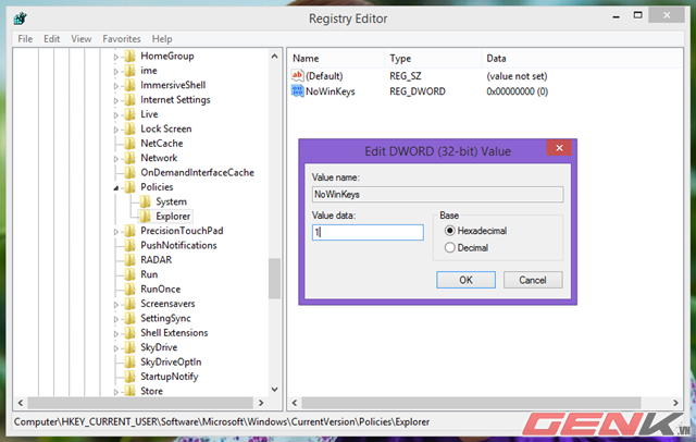 Sau đó tiến hành tạo một DWORD mới trong Explorer với tên gọi là “NoWinKeys”. Và thiết lập giá trị cho nó là “1” bằng cách nhấp đôi chuột vào nó. Sau đó nhấn OK để lưu lại.
