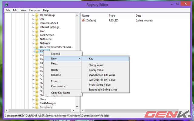 Nhấn phải chuột vào Policies và chọn lệnh New > Key