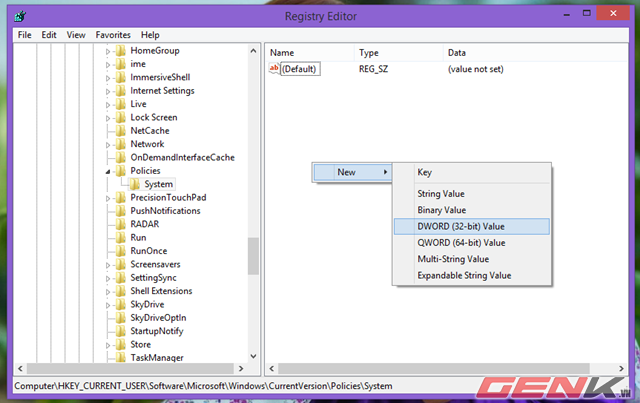 Bây giờ bạn hãy nhấp chuột vào khóa System vừa tạo và di chuyển sang khung bên phải, nhấn phải chuột và chọn lệnh New > DWORD (32-bit) Value.