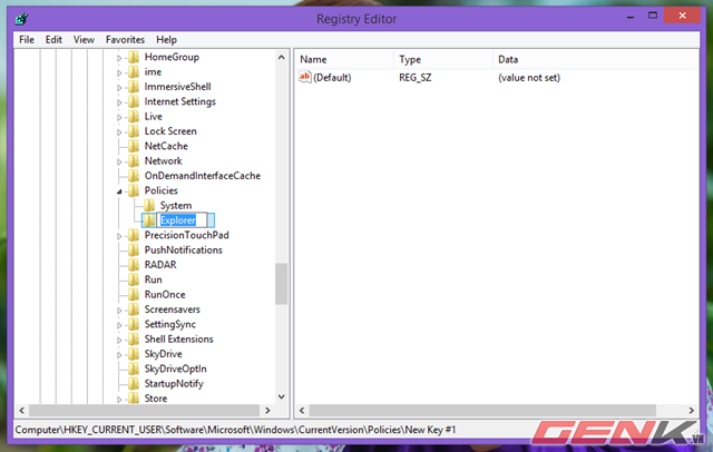 Khởi động Registry Editor lên và truy cập vào đường dẫn như trên. Nhưng thay vì tạo 1 khóa mới với tên gọi System thì bạn hãy tạo 1 khóa mới có tên gọi là “Explorer”.