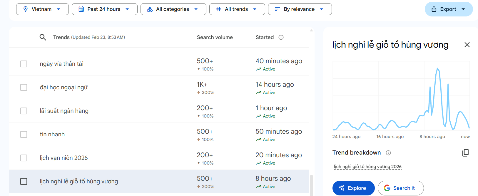 Theo thống kê từ Google Trends trong 24 giờ qua, cụm từ “giỗ tổ Hùng Vương 2026 nghỉ mấy ngày” bất ngờ vươn lên vị trí cao trong danh sách truy vấn tăng trưởng mạnh, được gắn nhãn bùng nổ. Ngay phía sau là các từ khóa na ná như “lịch nghỉ giỗ tổ Hùng Vương 2026”, “giỗ tổ Hùng Vương 2026”,...