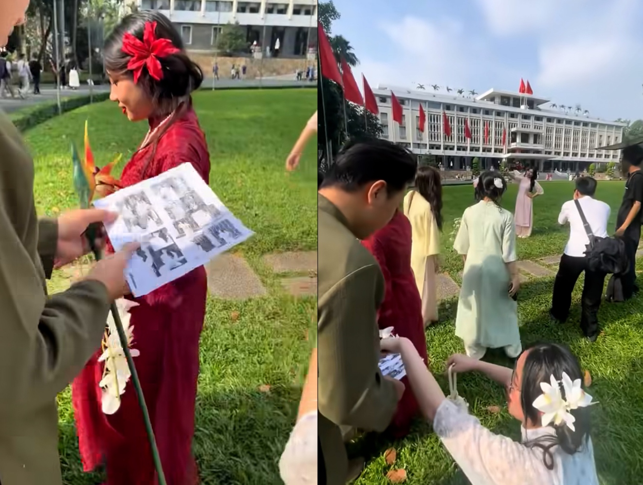 Trong video, bối cảnh là một bãi cỏ rộng trước địa điểm quen thuộc, các mẫu mặc áo dài, tóc cài hoa, tạo dáng giữa nắng chiều. Xung quanh là vài nhiếp ảnh gia, trợ lý, người cầm máy, người cầm hoa, người cầm… giấy. Thứ được chuyền tay nhau liên tục chính là xấp “giáo án” này. Mỗi tờ in hàng chục bức ảnh to nhỏ, đủ mọi kiểu đứng, ngồi, nghiêng người, quay lưng, cúi đầu, ánh mắt nhìn xa hay nhìn xuống. Có ảnh chụp toàn thân, có ảnh cận mặt, có ảnh lấy tay áo, có ảnh lấy bóng đổ.