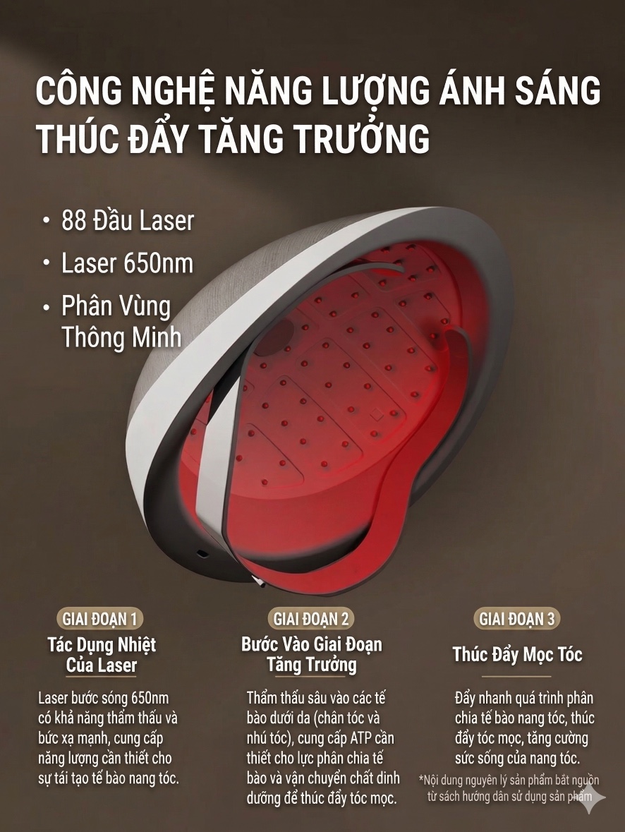 Sản phẩm ứng dụng công nghệ LLLT (liệu pháp laser năng lượng thấp), sử dụng 88 hạt đèn laser bước sóng 650nm để chiếu trực tiếp vào da đầu. Cơ chế hoạt động chia làm 3 giai đoạn: đầu tiên, hiệu ứng nhiệt từ laser kích hoạt quá trình tái tạo tế bào nang tóc; tiếp theo, tia laser xuyên sâu vào gốc tóc để bổ sung ATP, hỗ trợ quá trình phân chia tế bào; sau cùng là thúc đẩy nang tóc phát triển và tăng sức sống cho từng sợi tóc.